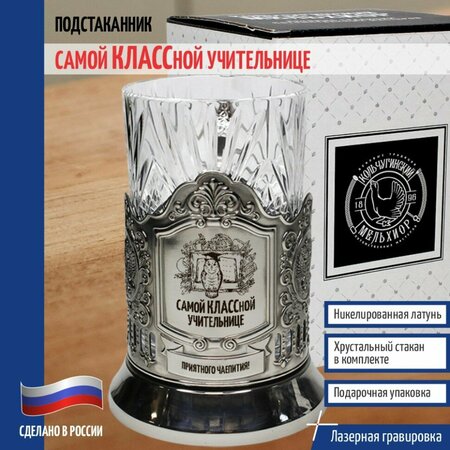 Комплектация: Подстаканник (никелированная латунь марки Л68), Стакан (Хрусталь, 220 мл), Подарочная коробка (15 х 12 х 12 см). Производитель подстаканника: Кольчугинский мельхиор (г. Кольчугино, Владимирская обл, Россия). Производитель стакана: Бахметьевский завод (г. Никольск, Пензенская обл, РФ). Способ нанесения рисунка: Лазерная гравировка (нанесена на лицевую часть подстаканника). Высота подстаканника со стаканом: 12 см. Внешний диаметр подстаканника: 7,1 см. Внутренний диаметр подстаканника: 6,7 см. Диаметр наиболее широкой части стакана: 6,6 см. Объём: 220 мл. Вес: 180 г. Размер: 12 x 10 x 8 см. Каждый фрагмент оформления изображения на железе выполнен методом художественно штамповки. История подстаканников неразрывно связана с железнодорожным транспортом, где они вместе с граненым стаканом из стали неотъемлемым элементом сервировки стола в поездах ржд с советских времен. Подарочный металлический подстаканник дополнит интерьер, служа практической функции, защищая руки от ожога и обеспечивая устойчивость в движении. Не просто элемент декора, но еще и отличный сувенирный подарок для любителей путешествий по России. Атрибут чайных встреч, который тесно связан с атмосферой путешествий и уютом времен СССР. Престижный презент в старинной стилистике идеально подойдет к любому торжественному событию: 8 марта, 23 февраля, Новому году или Дню рождения. Мама, папа, муж, жена, коллега - каждый будет чувствовать себя особенным и любимым.
