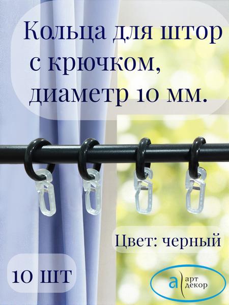 Кольцо с пластиковыми крючками. Используется для подвешивания штор или тюля к круглому карнизу, струнному или тросовому карнизу. Эти кольца с крючками подойдут тем, кто использует шторы со шторной лентой. Особенности: - Диаметр: 10 мм - Цвет: Чёрный - Количество в упаковке: 10 штук Преимущества: - Элегантный дизайн: Кольца с крючком придают вашим шторам современный и стильный вид. - Прочность: Высокое качество материала гарантирует долгую службу без потери формы или цвета. - Удобство использования: Простая установка и регулировка крючков позволяют легко подвешивать шторы. Эти кольца подходят для любого интерьера, будь то классический, минималистичный или современный. Они отлично сочетаются с различными типами штор и карнизов, делая ваш дом более гармоничным и ухоженным.