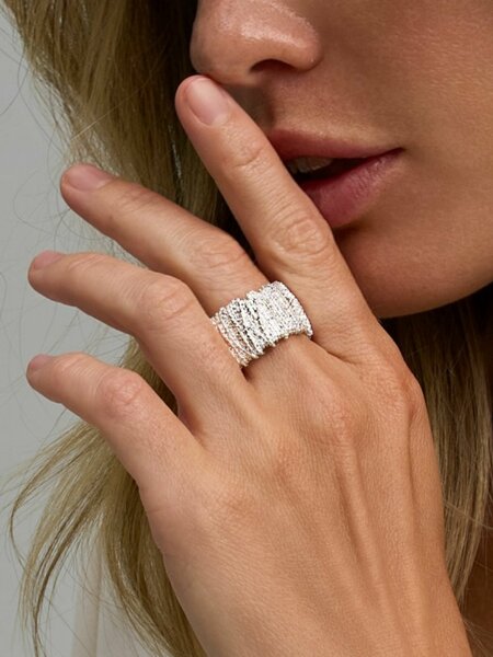 Так как изделие сделано из качественного материала, нужно приложить усилие, чтобы согнуть колечко под размер. Также отрегулировать кольцо можно с помощью ножниц. Внутрь кольца вставьте ножницы и разомкните их. Этот широкое кольцо в стиле Олд мани для девушек подчеркнет вашу индивидуальность и стиль, дополнив любой образ – от повседневного до вечернего. Кольцо регулируемое, поэтому его можно носить на любом пальце. Это крупное кольцо будет выгодно смотреться на указательном пальце, на большом пальце, на безымянном и среднем пальце, что делает это кольцо металлика универсальным украшением. Оно не темнеет и не меняет своего внешнего вида со временем, что делает его долговечным металлическим кольцом цвета серебро. Это колечко из серебряного металла привлекает внимание своим массивным и эстетичным видом. Благодаря своему дизайну оно подойдет как для повседневного использования, так и для особых случаев, например, для новогоднего вечера или дня рождения. Кольцо женское бижутерия – это не только красивый аксессуар, но и символ стиля и моды. Оно идеально подойдет для девушки или женщины, которая следит за последними тенденциями. Подойдет под любой стиль, как олд мани и тихая роскошь, так и кэжуал. Кольцо женское бижутерное широкое безразмерное будет прекрасным украшением, которое можно носить как ежедневно, так и на особых случаях. Не упустите возможность приобрести это кольцо бижутерию, необычный дизайн и высокое качество делают его привлекательным выбором для всех любителей украшений. Закажите кольцо бижутерию широкое безразмерное прямо сейчас и получите возможность выделиться из толпы, подчеркнуть свою индивидуальность и стиль. Будьте модными и элегантными с этим украшением!