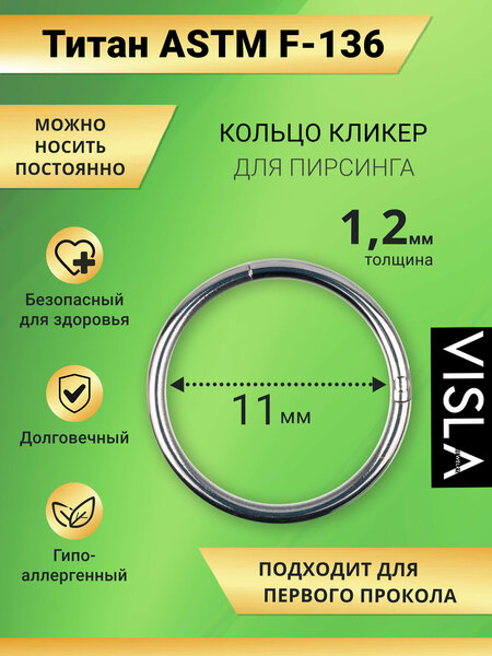 Серьги для пирсинга из титана от бренда Visla Jewelry. Толщина кольца 1,2 мм, диаметр 6,7, 8,9,10,11 или 12 мм Титановое кольцо кликер для базового пирсинга, который подходит всем: девушкам и парням. Классическая моносерьга предназначена для проколов хеликс, трагус , козелок, для прокола крыла носа или септума. Современные сережки для пирсинга возможны в проколах мочек ушей, для проколов брови, конч, рук или пирсинге дейс, септум, подходит для пирсинга губ (смайл). Декоративная сережка для пирсинга дополнит ваш стильный и неповторимый образ. Сегментное кольцо унисекс , можно носить мужчинам и женщинам. Материал абсолютно безопасен для здоровья, не вызывает аллергии и легко приживается в проколе, ведь сплав ASTM F-136 известен как медицинский титан, из которого изготавливаются хирургические инструменты и импланты . Изделия из титана можно использовать для первичных (свежих), а так же в уже заживших проколах. Данный вид пирсинга представлен в натуральном серебристом цвете , без вставок.