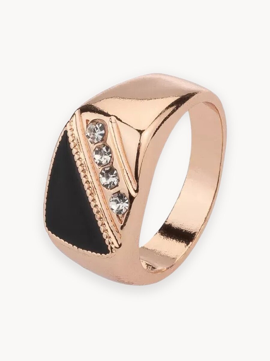 Перстень золотого цвета бижутерия. Максимальная ширина кольца 12 мм, средний вес - 5,5 г. Кольцо золотистого цвета украшено треугольной вставкой черной эмали и полоской из четырех фианитов - это отличный подарок для всех и по любому поводу. Позолоченная печатка выглядит солидно и элегантно, создаст отличный акцент любого вашего образа. Не вызывает аллергических реакций при контакте с кожей, даже при регулярной носке. Не помешает в повседневных делах и легко сочетается с другими украшениями. Идеально отполированная поверхность отражает свет и привлекает внимание. Вставка из черной эмали и четырех фианитов выглядит стильно и благородно. Высококачественный бижутерный сплав, который еще называют медицинский сплав или дубайской позолотой, не подвержен ржавчине, не темнеет, не окисляется от воды или пота.