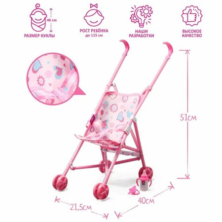 Летняя коляска для кукол детально проработана и по форме и функциям напоминает реальный прототип. Особенности коляскиУстойчивый металлический каркас, надёжные пластиковые колёса. Сиденье сшито из плотного текстиля. Подойдёт для куклы ростом до 30 см. Компактно складывается и не занимает много места при хранении и транспортировке. Чем полезны игры с коляскойКатая куколок в коляске, маленькие леди учатся заботе и ответственности, при этом у них развиваются воображение и эмоциональное восприятие. Предназначена для детей от 3 лет. Рекомендуется использовать под присмотром взрослых. Дополнительно Высота от пола до ручки — 48 см; Размер сиденья — 10 х 18 см; Длина спинки — 30 см.