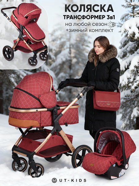 Коляска 3 в 1 для новорождённых объединяет люльку, прогулочный блок и автолюльку. Она подойдёт с первых дней жизни и станет удобным решением для дома, прогулок и поездок в машине. Коляска 3 в 1 трансформер легко меняет формат: прогулочный блок превращается в люльку, а автолюлька устанавливается на шасси с помощью адаптеров. Малыш может спать, не просыпаясь после дороги. Удобство и функциональность Коляска прогулочная всесезонная подходит для любого времени года. Глубокий капюшон с 4 положениями защищает от солнца и ветра. В комплект входят москитная сетка, дождевик и зимняя накидка для ножек с ветрозащитным окошком и покрытием UV50+ — можно гулять в любую погоду. Коляска складывается за несколько секунд и помещается в багажник. При весе 11,6 кг остаётся прочной и устойчивой. Комфорт для родителей и малыша • Коляска прогулочная оснащена регулируемой ручкой с девятью уровнями — удобно родителям любого роста. • Поворотные передние колёса фиксируются для езды по снегу и неровностям. • Увеличенные задние колёса 30 см с тормозом обеспечивают плавный ход. • Пружинная амортизация помогает мягко проходить бордюры. • Просторное спальное место с мягким матрасиком (можно стирать) и вентиляцией по бокам. Безопасность и надёжность • Детская коляска оснащена 5-точечным ремнём безопасности с мягкими накладками и съёмным бампером • Все ткани безопасны для кожи новорождённого • Автолюлька весом 2,2 кг имеет анатомическую вкладку, складной капюшон и ремни безопасности — ребёнку удобно и в дороге, и на прогулке • Передние колёса поворачиваются на 360°, при необходимости фиксируются, задние оснащены тормозом. Всё необходимое в комплекте Сумка для мамы, подстаканник, дождевик, москитная сетка, адаптеры для автолюльки, наматрасник и слюнявчик — коляска детская укомплектована всем, что нужно с первых дней. Большая корзина под сиденьем вмещает покупки и детские вещи. UT-KIDS — коляска прогулочная всесезонная, созданная для комфорта ребёнка и спокойствия родителей. Лёгкая, удобная и продуманная — эта коляска для новорождённых станет надёжным помощником каждый день.
