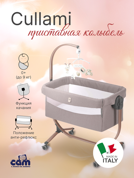 Люлька с функцией совместного сна, подходит для любой кровати. Информация об использовании 0- 9 кг. Описание Уникальный современный дизайн 8 регулировок высоты, откидная боковина для совместного сна Антирефлюксная позиция Горизонтальное перемещение люльки (перемещение до 16 см.) Для совместимости со всеми типами кроватей. Функция качания 4 поворотных колеса, 2 из которых оснащены тормозом. Ремни для крепления к кровати для совместного сна. Включает в себя: металлический каркас, держатель для москитной сетки и мобиля, мягкий матрас (85 - 50 – 3см), внутреннее пространство из мягкой ткани, сетчатое окно. Съемная ткань, ручная стирка при 30 °. Дополнительные аксессуары: Комплект постельного белья для Cullami art. 926, Москитная сетка для Cullami арт. 927, Мобиль для Cullami арт. 928 в комплект не входят. Размеры И ВЕС Open: L 105 - W 59 - H 82/134 cm. 10.9 kg. Безопасность Соответствует стандарту EN1130 Соответствует стандарту EN16890