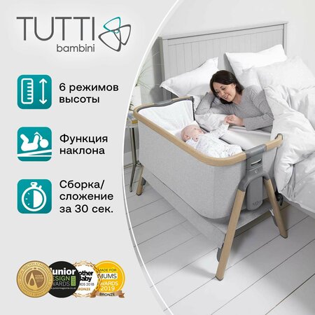 Колыбель Tutti Bambini CoZee – это высокая функциональность, удобство использования и истинно английский стиль. Лаконичная форма, простые линии и элегантные расцветки – эта колыбель подчеркнёт ваш вкус и станет настоящим украшением детской комнаты. В комплекте колыбельки матрас, сумка для переноски и ремни для крепления к родительской кровати. Дополните CoZee аксессуарами (приобретаются отдельно): качалка, комплекте постельного белья и простыней Perina, кокосовый матрас и наматрасник Fiorellino. Для комфорта мамы рекомендуем приобрести кресло-качалку Tutti Bambini: для кормления и отдыха. Выполненный из алюминия, каркас отличается прочностью и лёгкостью, что позволяет с особым удобством брать колыбель CoZee с собой в поездки или на дачу. Благодаря инновационному механизму, сложить и разложить колыбель можно всего за 30 секунд – в сложенном виде конструкция компактна и удобна для транспортировки в специальной сумке, которая входит в комплект. Кроме того, Tutti Bambini CoZee идеально подходит для комфортного совместного сна. Отрегулируйте высоту детского ложа (имеет 6 положений), снимите боковой борт и зафиксируйте колыбель к родительской кровати при помощи специальных ремней – так вы сможете быть рядом с малышом всю ночь, при этом не лишая ни его, ни себя собственного пространства для сна. Чтобы отрегулировать угол наклона ложа колыбели CoZee, установите разные уровни высоты в изголовьях. А боковой бортик из дышащей сетчатой ткани позволит наблюдать за малышом, даже если вы находитесь на другом конце комнаты. Комплектация Колыбель Тканевая обивка для колыбели Матрас Ремни для крепления к родительской кровати Полочка Колеса комплект Сумка для переноски