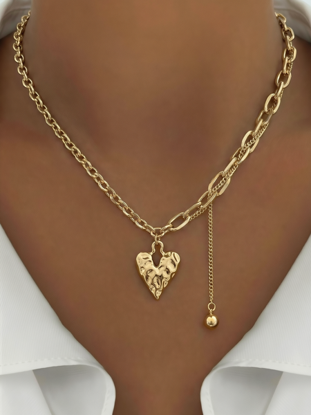 Колье женское Noima изготовленное из бижутерного сплава, состоит из подвески в форме "мятого" сердца, цепочки переходящей в крупную цепь и маленькой золотой бусины на тонкой цепочке, которая вплетена в крупные звенья колье - добавляя дерзости украшению. Такой вариант колье поможет оживить деловой костюм или добавить пикантности вечернему наряду. Длина колье составляет 45 см, дополнительно предусмотрен добор длиной 5 см для регулировки длины цепочки. Гипоаллергенный бижутерный сплав колье обеспечивает комфорт при носке и подходит для чувствительной кожи, покрытый золотом делает его устойчивым к повреждениям и износу. Украшение бережно упаковано в стильную брендированную коробочку, что делает бижутерное колье женское Noima готовым подарком к вручению без дополнительных усилий маме, девушке, сестре или подруге на любой праздник и случай.