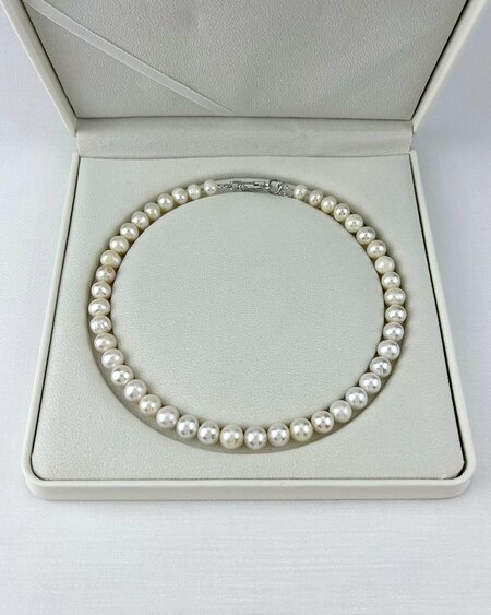 Колье с жемчугом «Гламур», натуральный жемчуг, ожерелье, бусы Жемчуг белоснежного цвета с переливами, высокое качество, правильная форма, повышенный блеск Прекрасно подойдет к стильному образу. Идеальный подарок. Колье из натурального жемчуга «Гламур» - идеальный вариант элегантного украшения. Удобный и современный замочек лобстер. Премиум фурнитура, родиевое покрытие. Длина колье с жемчугом 43 см + 5 Диаметр жемчужин 8-9 мм Натуральный жемчуг - символ чистоты и благородства. Он имеет множество привлекательных свойств и качеств, таких как улучшать кожу, повышать настроение и дарить благоприятную энергию. Изделия из жемчуга всегда актуальны. Жемчуг можно носить не только с вечерними платьями, но и с деловыми костюмами, простой одеждой. Можно подарить семье или друзьям как изысканный и практичный подарок, и друзья, получившие такой подарок, обязательно будут очень счастливы. Подарочная Упаковка. Приятных Вам покупок!