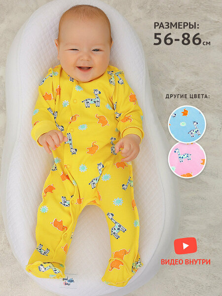 Яркий нательный комбинезон со смешными жирафиками по нему выделит вашего малыша на детской площадке и не оставит без улыбки ни одного прохожего. Мягкий и легкий комбинезон для новорожденных изготовлен из натурального хлопка средней плотности, что позволит вашему малышу чувствовать себя комфортно в теплое время года. Натуральный материал не вызовет аллергических реакций на нежной коже малыша и даст возможность ей «дышать», прост в уходе и не усаживается после стирки. Комбинезон - это отличный вариант основной одежды для новорожденного в первый год жизни. Дети очень чувствительно реагируют на переодевания в этот период. Комбинезон для малышей застегивается при помощи кнопок, расположенных по всей длине на одной ножке. Такая застежка помогает мамам малышей снять без труда комбинезон при необходимости. Ножки в комбинезоне закрыты, а шейку малыша прикроет мягкий воротник-стойка. Такая одежда для новорожденных подойдет на рост от 56 до 80 см для малышей в возрасте от самого рождения до 1 года. Модель детского слипа в 56 и 62 размере выполнена со швами наружу, что бы не раздражать нежную кожу новорожденного. Такой комбинезон может стать отличным вариантом в качестве первой одежды для новорожденного в роддом или на выписку. Состав ткани полностью натуральный, 100% хлопок. Детский нательный комбинезон произведен в России в соответствии с требованиями ГОСТ. Наше производство придерживается самых высоких стандартов и с вниманием относится к качеству одежды для самых маленьких. Швы обрабатываются специальным образом и сохраняют свою мягкость, не доставляя дискомфорту малышу. Данный комбинезон слип будет отличным вариантом для вашего ребенка в качестве повседневной одежды. обращаем ваше внимание, что подбор размера индивидуален и зависит от особенностей вашего малыша. Данная модель прямого покроя. Прекрасно подойдет худеньким малышам и деткам со средней комплекцией. Для крупных малышей мы рекомендуем приобрести данную модель на размер больше.