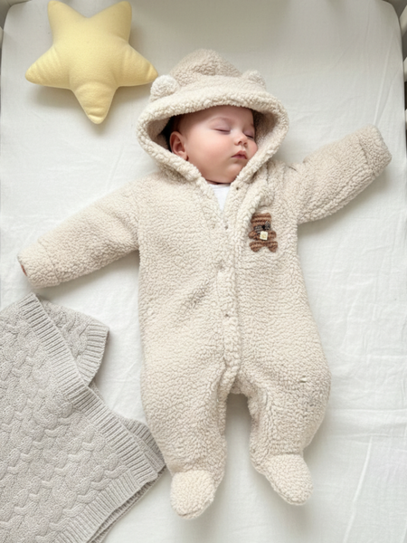 Укутайте вашего малыша в нежность и тепло! Этот комбинезон "Teddy" создан специально для первых месяцев жизни (от 0 до 3 месяцев). Он выполнен из невероятно мягкого и пушистого материала, который дарит ощущение уюта, как в маминых объятиях. Почему стоит выбрать именно этот комбинезон? Эксклюзивный декор: На груди красуется очаровательный вязаный мишка, который придает изделию особый стиль и премиальный вид. Материал: Ткань "Тедди" очень приятная на ощупь, гипоаллергенная и отлично сохраняет тепло. Милый дизайн: Капюшон с маленькими ушками превратит вашего малыша в настоящего плюшевого медвежонка — идеально для первых фотосессий! Удобство: Продуманная застежка на кнопках позволяет легко и быстро переодеть ребенка, не доставляя ему дискомфорта.