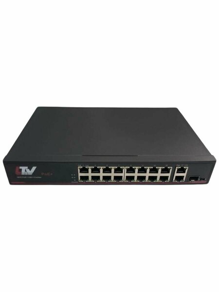 Сетевое оборудование, коммутатор, дальность передачи до 100 м (250 м в режиме CCTV), интерфейс передачи данных 16xRJ-45 (c PoE), 2xRJ-45 (uplink), 1xSFP (uplink), cкорость передачи данных 16x100 или 16x10 Мб/с (CCTV), 3x1000 Мб/с, рабочая температура -10…+55, грозозащита 3кВ, мощность 300 Вт, 60 Вт (порт 1), 30 Вт (порты 2-16), электропитание AC220V, 4, 2А
