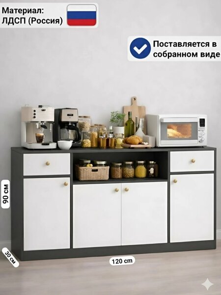 Продуманный дизайн: Комод оснащен открытыми полками для техники, выдвижными ящиками и вместительными шкафчиками. Идеально подходит для создания "кофейного уголка".