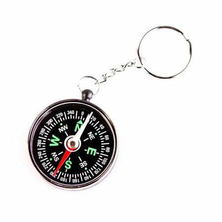 Туристический компас с цепочкой и кольцом, круглая капсула выполнена из пластмассы. Внутри капсулы размещена магнитная стрелка, на дне капсулы находится циферблат. На циферблате имеется шкала градусов с ценой деления 5˚ и индексы N, NE, E, SE, S, SW, W, NW (N-север, S-юг, E-восток, W-запад, NW-северо-запад, NE-северо-восток, SE-юго-восток, SW-юго-запад).