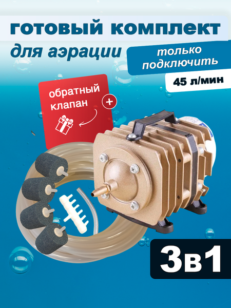 Готовый универсальный аэратор для пруда комплект с компрессором — это надежное решение для водоемов площадью до 40 м². В набор входит поршневой компрессор аэратор для пруда, корундовые цилиндры распылители воздуха, воздушная трубка, обратный клапан и все необходимые аксессуары для подключения. Аэратор для пруда предназначен для обогащения воды кислородом, что улучшает качество воды, предотвращает цветение и создает оптимальные условия для рыб и водных растений. Благодаря распылителю аэратору и равномерному распределению пузырьков, система обеспечивает эффективную аэрацию пруда и водоема. Подходит как донный аэратор для пруда, так и прудовой аэратор для небольших водоемов. Малошумный электрический аэратор можно устанавливать на открытом воздухе, прикрывая от осадков. Такой компрессор для пруда отличается экономичным энергопотреблением и высокой производительностью. Электрический насос аэратор для пруда подходит для круглогодичного использования, включая зимний период — помогает поддерживать лунку и предотвращает полное промерзание воды. Подсоедините распылитель корундовый камень к компрессору и погрузите в пруд на глубину до 0,5-0,8 метра летом. В комплект воздушного компрессора входит переходник-гребенка разветвитель для подключения распылителей. Свободные выводы на гребенке необходимо заглушить комплектной воздушной трубкой. Готовый аэратор в сборе сократит ваше время на поиск и подбор в случае покупки отдельными комплектующими. Характеристики: Тип: поршневой компрессор для пруда Производительность: 45 л/мин (2500 л/ч) Потребляемая мощность: 22 Вт Вес: 2,2 кг Размер компрессора: 160×90×90 мм Трубка аэратор для воздуха: длина 15 м, диаметр 4–6 мм Распылители: корундовый цилиндрический- 4 шт, 45х48 мм. Корундовый цилиндрический камень аэратор — долговечный и равномерно распределяющий воздух Объем пруда: 10-40 м3 Объем аквариума: 10-40 м3 Объем септика: 1-2 м3