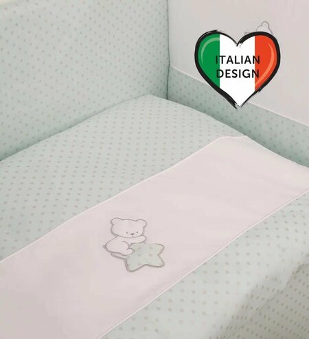 Комплект в кроватку Lepre Argento (6 предметов) изготовлен по стандартам имеет европейский сертификат и изготовлен из натурального гипоаллергенного сырья, что довольно значимо для чувствительной кожи ребенка. Lepre постельное белье Argento – это экологически чистое постельное белье для новорожденных, произведенное из 100%-го длинноворсового хлопка, обработанного с учётом жестких европейских норм в Польше. Изготовлен по стандартам CONFIDENCE IN TEXTILES, имеет европейский сертификат. Приятные глазу цветовые сочетания помогают адаптации ребенка в новом для него мире, а декорирование забавным медвежонком, мило уснувшем на полумесяце, способствует расслаблению и сладким снам малыша. Мягкий борт создает индивидуальную зону комфорта и делает сон Вашего малыша безопасным: защищает от сквозняков, задерживает шум, оберегает от возможных ударов о бортики кроватки. Борт состоит из двух независимых частей, что позволяет отстегивать фронтальную секцию для визуального контакта. Можно закрепить борт по всему периметру кроватки или только в изголовье. Для подросшего малыша возможен вариант диванчика. Крепится удобными широкими лентами-завязочками. Чехлы борта съёмные - на молнии. Высота 40 см по всему периметру. Простынь на резинке обеспечит идеальную посадку на матрас и не позволит складкам воздействовать на кожу ребенка. Данный вид простыни изначально был создан для маленьких детей, которые очень любят двигаться во сне, и могут запутаться в обычной простынке. Простыня на резинке надёжно фиксируется на матрасе, не сминается и не комкается. Резинка хорошо удержит текстиль на поверхности матраса, и его не придется постоянно поправлять. Одеяло очень легкое, воздушное и абсолютно гипоаллергенно. Имеет оптимальную терморегуляцию. Пододеяльник на молнии. Комплект упакован в удобный прозрачный кофр с крышкой на замке, открывающемся в две стороны, по периметру. В нижний и верхний швы вшиты пластиковые шнуры для сохранения формы и предотвращения повреждения упаковки. Стильные и удобные веревочные ручки надежно закреплены сверху с помощью пластиковых держателей. Внутри - фирменная листовка Lepre формата А3. В такой упаковке комплект постельного белья для новорожденного готов к вручению в качестве подарка счастливым родителям, а также удобен для переноски. Качество упаковки позволит использовать ее в дальнейшем самостоятельно для хранения множества необходимых вещей.