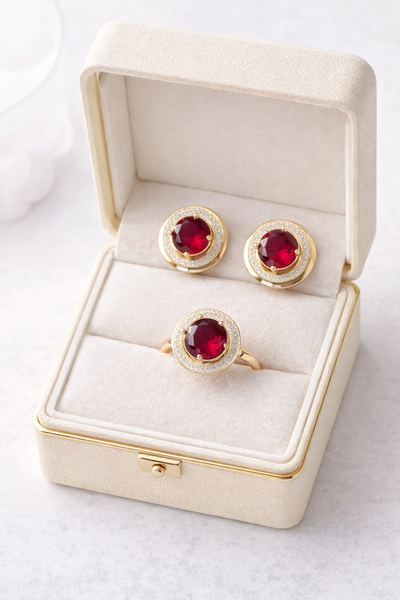 серьги и кольцо с красивым ярким рубиновым камнем