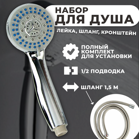 Удобный и качественный набор для душа Do.Korona три в одном. В набор входит: душевая лейка 5 режимов, шланг 150 см, кронштейн ( держатель ) для душевой лейки и монтажный набор. Заводская упаковка блистер.