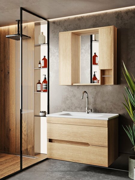 Комплект мебели для ванной комнаты Marmara, встроенная раковина с тумбой и зеркальным шкафчиком, в натуральном стиле