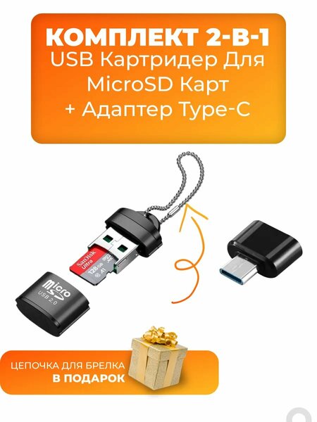 Удобный комплект из картридера для считывания MicroSD карт и Переходника с USB на Type-C для SD card на компьютер или ноутбук. Считыватель карт подойдет для различных устройств. Картридер micro sd подключается через USB разъем. Компактный кардридер выполнен из качественных алюминиевых материалов. Упакован card reader в блистер пакет. Читаются карты форматов microSD, microHSD, карта micro SD, на которых могут быть файлы, фотографии, видеофайлы. На переходнике есть удобная металлическая цепочка, за которую вы можете прикрепить к ключам как брелок. В комплект также входит адаптер с USB на Type-C порт в ноутбук, MacBook или сотовый телефон. Данный комплект сделает подойдет для автомагнитолы, ноутбука, компьютера и мобильного устройства.