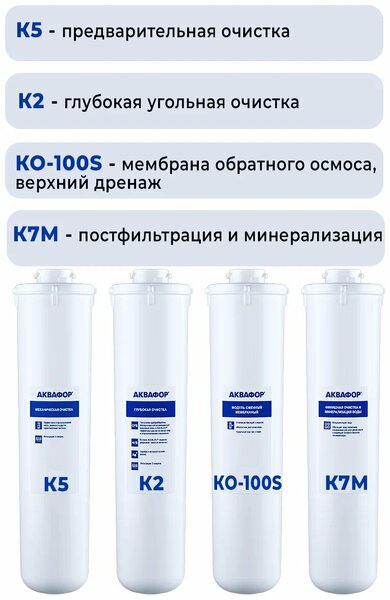 для фильтров DWM-102S / DWM-201 Морион; в комплекте четыре модуля: K5 - предварительная очистка; K2 - глубокая фильтрация; K-100S - обратноосмотическая мембрана; K7M - постфильтрация и минерализация