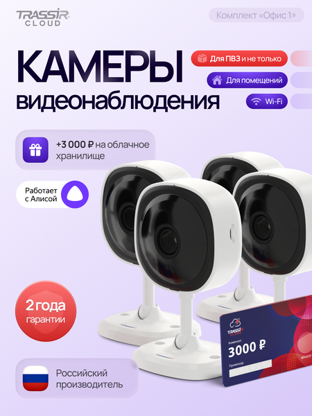 Комплект облачного видеонаблюдения TRASSIR CloudOffice1 состоит из четырех IP камер TRASSIR TR-W2C1 (2.8 мм) и промокода на 3000 рублей для активации в личном кабинете TRASSIR Cloud. 3000 рублей хватает на 6 месяцев записи в облако архива с четырех камер — с настройкой тревожных уведомлений о движении, звуке и сигналах встроенного детектора саботажа, экспортом видео, расширенным функционалом управления камерой. (В зависимости от выбранного Вами тарифного плана TRASSIR Cloud) ip камера видеонаблюдения TRASSIR TR-W2C1 (2.8 мм) Внутренняя 2 Мп (1920×1080) IP-камера TRASSIR TR-W2C1 (2.8 мм) оснащена Wi-Fi-модулем для беспроводной передачи данных. Базируется на высокочувствительной (0.005 лк) 1/2.9-дюймовой CMOS-матрице, укомплектована объективом с фиксированным фокусным расстоянием 2.8 мм.