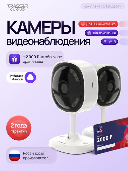 Комплект облачного видеонаблюдения TRASSIR CloudStandart состоит из двух ip камер видеонаблюдения TRASSIR TR-W2C1 (2.8 мм) и промокода на 2000 рублей для активации в личном кабинете TRASSIR Cloud, что эквивалентно 6 месяцам записи архива в облако с настройкой тревожных уведомлений о движении, звуке и сигналах встроенного детектора саботажа, экспортом видео, расширенным функционалом управления камерой.( В зависимости от выбранного Вами тарифного плана TRASSIR Cloud) Вайфай камера TRASSIR TR-W2C1 (2.8 мм) Внутренняя 2 Мп (1920×1080) IP камера TRASSIR TR-W2C1 (2.8 мм) оборудована Wi-Fi-модулем для беспроводной передачи данных. Базируется на высокочувствительной (0.005 лк) 1/2.9-дюймовой CMOS-матрице, укомплектована объективом с фиксированным фокусным расстоянием 2.8 мм.