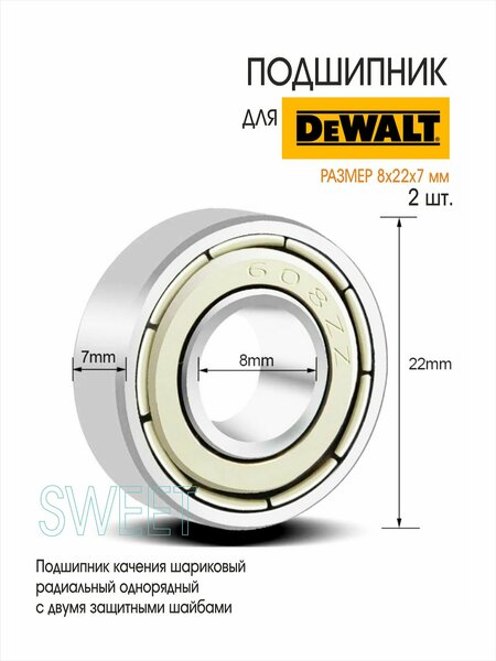 Комплект подшипников для болгарки (УШМ) DeWalt D28136 TYPE 2 Код: N175104 номер на схеме инструмента : 72 - Подшипник 608 ZZ (схему прилагаем - фотокарточка в товаре) Размер: внутренний диаметр d= 8мм. внешний диаметр D= 22мм. ширина B= 7мм. вес 0,0116 кг. Подшипник шариковый радиальный однорядный с двумя защитными металлическими шайбамиZZ - защитные шайбы из листовой стали с обеих сторон (в зависимости от партии могут быть желтого либо стального цвета и отличаться от представленного на фотографии). Защитные шайбы предохраняют подшипник от утечки смазки, а также от проникновения пыли и грязи в полость подшипника. Класс точности: 0 (ABEC1) Сепаратор: стальной Продукция не подлежит обязательной сертификации