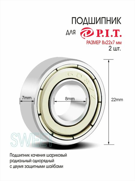 Комплект подшипников для триммера аккумуляторного P.I.T. (PIT) PTR20H-380A Код: PTR20H-380A/35 номер на схеме инструмента : 35 - Подшипник 608 ZZ (схему прилагаем - фотокарточка в товаре) Размер: внутренний диаметр d= 8мм. внешний диаметр D= 22мм. ширина B= 7мм. вес 0,0116 кг. Подшипник шариковый радиальный однорядный с двумя защитными металлическими шайбамиZZ - защитные шайбы из листовой стали с обеих сторон (в зависимости от партии могут быть желтого либо стального цвета и отличаться от представленного на фотографии). Защитные шайбы предохраняют подшипник от утечки смазки, а также от проникновения пыли и грязи в полость подшипника. Класс точности: 0 (ABEC1) Сепаратор: стальной Продукция не подлежит обязательной сертификации