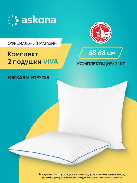 Комплект состоит из 2х подушек Viva 68х68 ! Подушка Viva - универсальная классическая набивная подушка. Наполнитель равномерно распределен внутри и придает подушке приятную упругость. Чехол из микрофибры обладает впитывающей способностью, долговечностью и гипоаллергенность, а декоративный синий кант по периметру добавляет изящности. Достоинства Viva: