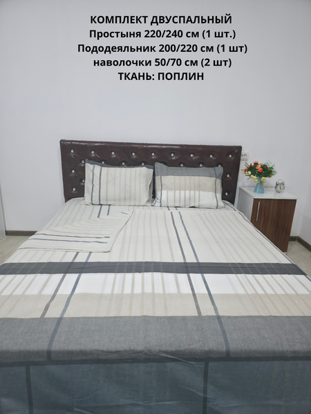 Погрузитесь в комфорт и уют с этим высококачественным комплектом постельного белья из поплина. Состав комплекта: Пододеяльник: 1 шт 220/200 cм Простыня: 1 шт. 240/220 cм Наволочки: 2 шт. 50/70 см Материал — 100% натуральный хлопок, который отличается мягкостью, прочностью и воздухопроницаемостью. Поплин — это плотная, но одновременно лёгкая ткань, которая прекрасно сохраняет форму и цвет даже после многочисленных стирок. Характеристики: Материал: поплин (100% хлопок)