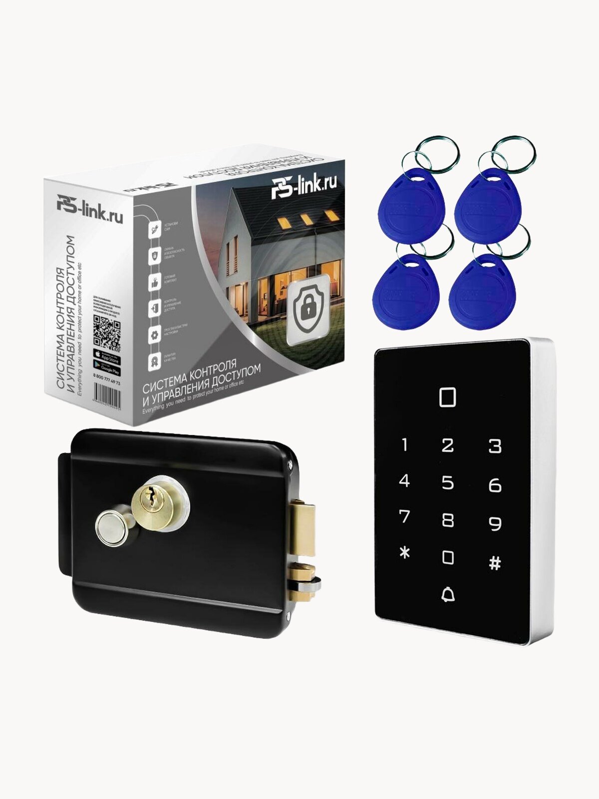 Комплектность: панель СКУД, замок, монтажный набор, RFID ключ, блок питания, инструкции