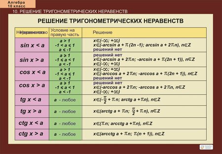 Комплект таблиц "Алгебра 10 класс" – незаменимый помощник для школьников, учителей и всех, кто изучает этот предмет. Наглядные таблицы с основными формулами, правилами и определениями помогут быстро вспомнить необходимую информацию и упростят процесс обучения. Этот комплект станет отличным подарком для учителя в День учителя или просто так, как знак признательности за его труд и профессионализм. Удобная упаковка и коричневый цвет таблиц делают их практичными и стильными. Комплект таблиц из 5 таблиц размером 680х980мм . Состав: 1 Формулы сложения. Формулы суммы и разности синусов(косинусов) 2 Решение тригонометрических неравенств 3. Периодичность тригонометрических функций 4. Критические точки функции. Максимумы и минимумы 5. Сложная функция