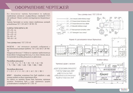 Комплект таблиц размером 680х980мм. Состав комплекта: 1. Геометрические построения 2. Нанесение размеров на чертежи 3. Оформление чертежей 4. Проекционное черчение 5. Чертежный шрифт