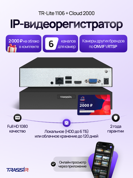 Комплект видеонаблюдения TR-Lite 1106 + Cloud 2000 состоит из сетевого видеорегистратора для построения систем видеонаблюдения на базе ip камер и карты для активации в личном кабинете TRASSIR Cloud. Данный комплект позволит подключить камеру стороннего производителя к облачному сервису TRASSIR Cloud, просматривать онлайн-поток и сохранять записи видео в облачное хранилище без использования HDD диска. Этот видеорегистратор отлично подходит для видеонаблюдения дома или офиса и поддерживает подключение камер видеонаблюдения сторонних производителей через ONVIF и RTSP.
