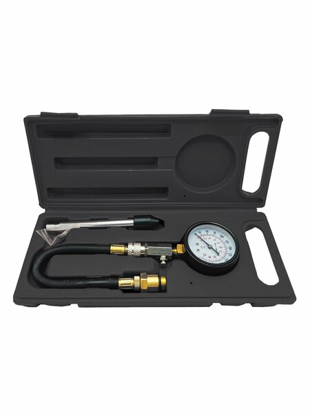 Компрессометр универсальный (3 предмета) AVS CT-06 (для бенз. ДВС) Компрессометр AVS CT-06 предназначен для точного измерения компрессии в цилиндрах бензиновых двигателей внутреннего сгорания. Устройство позволяет быстро и удобно оценить состояние поршневой группы, клапанов и герметичность камеры сгорания. Комплект включает манометр с клапаном сброса давления, два резьбовых адаптера для различных типов свечей и гибкий шланг, обеспечивающий легкий доступ к цилиндрам без необходимости демонтажа других компонентов двигателя. Прочный пластиковый кейс обеспечивает надежную транспортировку и хранение. Преимущества: — Компактная и легкая конструкция для удобства использования — Широкий диапазон измерений до 2,0 МПа (0-20 кгс/см²) — Универсальный прижимной адаптер для различных моделей бензиновых двигателей — Удобный пластиковый кейс для хранения и транспортировки Характеристики: Тип двигателя: бензин Тип устройства: стрелочный Крепление: резьбовое/прижимное Шкала манометра: 0-20 Бар (0-300 PSI) Резьба на втулке: M14x1,25 Вес: 0,64 кг Адаптеры резьбовые: M14×1.25, M18×1.5 Шланг гибкий резиновый: 320 мм Прижимной адаптер универсальный: 150 мм Пластиковый кейс: в комплекте