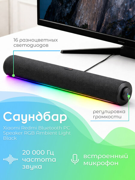 Саундбар для компьютера Xiaomi Redmi (ASB02A) с мягкой RGB-подсветкой и стереозвуком станет отличным дополнением для вашего компьютера или ноутбука. Важные особенности саундбара - удобная многофункциональная ручка для управления колонкой, несколько типов подключения и встроенный аккумулятор емкостью 1500 мАч. Четырехкомпонентная акустическая система обеспечивает сбалансированное звучание с шикарными басами. Симметричное расположение двухканального динамика обеспечивает равномерное распределение звука и эффект стереозвучания. Специально созданные для использования на рабочем столе динамики имеют наклон 53° и при размещении под дисплеем направляют звук на пользователя. Встроенный эквалайзер имеет пять предустановленных настроек для разных сцен использования саундбара: полночастотный режим, режим низких звуковых вибраций, вокал, игровой и кинотеатр. 16 разноцветных светодиодов и 5 световых эффектов дополняют звучание саундбара мягкой цветной подсветкой. Среди режимов подсветки есть светомузыка, режим камина, электрорадуга и другие. В режиме светомузыки подсветка двигается в такт вашим мелодиям. Общайтесь во время игр, проводите аудио конференции и деловые встречи с помощью встроенного в саундбар микрофона. Колонка имеет двойной разъем USB-A/USB-C для удобного подключения к различным устройствам без использования переходников. Режим Bluetooth 5.0 с низкой задержкой упрощает подключение смартфонов и планшетов. Стандартный вход 3,5 мм позволяет подключить проигрыватель компакт-дисков, виниловых пластинок, тв-приставки и другие устройства.