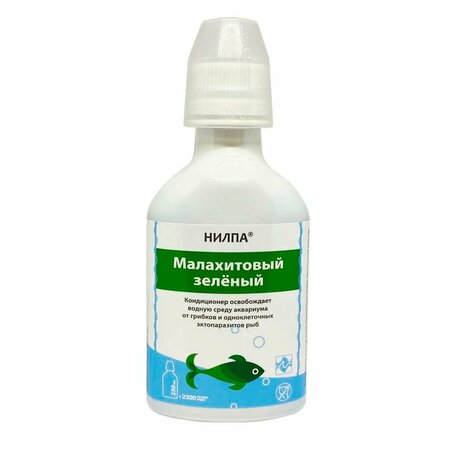 Кондиционер для воды в пресноводном и морском аквариуме. Оказывает оздоравливающее действие на водную среду аквариума. Препятствует размножению таких инфузорий как ихтиофтириус, криптокарион и других паразитических одноклеточных организмов, а также грибков родов сапролегния и ахлия. Область применения: Используется для кондиционирования воды в аквариуме и в карантинных емкостях. Применение кондиционера НИЛПА® «Малахитовый зеленый» делает водную среду безопасной для рыб, так как он препятствует размножениюи расселению болезнетворных организмов. Кондиционер можно с осторожностью использовать в аквариумах с растениями (нежные виды могут пострадать) и с водными беспозвоночными, такими как улитки, креветки фильтраторы и креветки Амано. Применять кондиционер возможно только в соответствии с данной инструкцией. Способ применения: Непосредственно перед внесением кондиционера в аквариум следует заменить 30% воды и только после этого вносить кондиционер. В качестве подменной воды надо использовать отстоянную в течение не менее суток водопроводную воду. В аквариумах с мягкой водой перед подменой следует измерить рН (Использовать НИЛПА® «рН тест»). Если значения этого показателя в аквариуме и в подменной воде различаются более, чем на одну единицу, то частичная замена воды осуществляется в два этапа с интервалом в 3-5 часов. Сначала следует подменить 20% воды, потом еще 20-30%. Использование кондиционера НИЛПА® «Малахитовый зеленый» целесообразно в интервалах значений рН аквариумной воды 6,3 – 8,5. Если с помощью подмен воды указанных значений рН добиться не удается, следует воспользоваться реактивами НИЛПА® «рН+» или НИЛПА® «рН-». Так как кондиционер разрушается при воздействии ультрафиолетовых лучей и легко удаляется из аквариума с помощью активированного угля и цеолита, перед внесением его в аквариум необходимо убрать картридж с сорбентами из фильтра и выключить ультрафиолетовый стерилизатор. В морском аквариуме желательно отключить пеноотделительную колонку. Также не рекомендуется во время кондиционирования оставлять в фильтрах материалы, удаляющие из аквариума аммиак, фосфаты, нитриты и нитраты. Наполнители, обеспечивающие механическую фильтрацию и биофильтрацию, не препятствуют оздоравливающему действию кондиционера. Во время кондиционирования следует аэрировать аквариум. Кондиционер является сильным красителем, возможно окрашивание силиконовых трубок и шлангов, элементов декорации аквариума. Особенно заметно окрашивание при использовании кондиционера в аквариуме с известняком и известковым туфом. После использования кондиционера рекомендуется заменить 35% воды и с интервалом в одни сутки опять подменить воду на одну треть. Быстро удалить остатки кондиционера и полностью устранить окрашивание воды можно с помощью активированного угля. Дозировка: В качестве оздоравливающей водную среду аквариума дозировки используется 1 мл кондиционера НИЛПА® «Малахитовый зеленый» на 10 литров воды. Необходимое количество кондиционера предварительно разбавляют в 100-200 мл кипяченой воды комнатной температуры и затем тонкой струйкой заливают в аквариум вблизи потока пузырьков воздуха от аэратора или потока воды от фильтра (помпы течения), что обеспечит быстрое, равномерное и безопасное для рыб смешивание кондицион