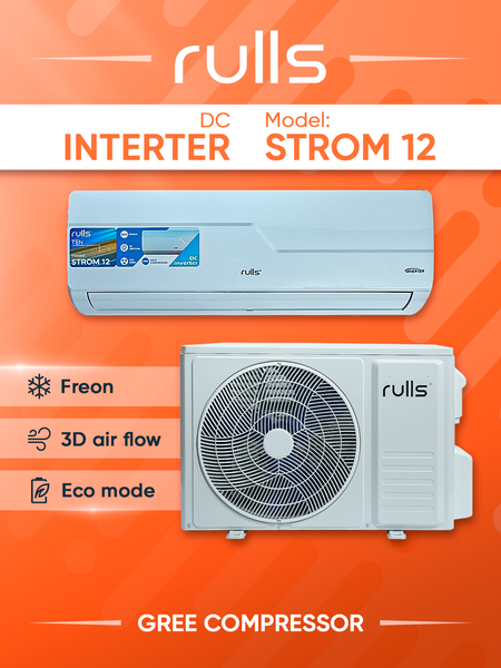 Кондиционер Rulls DC Inverter Strom 12 — современная инверторная сплит-система для эффективного охлаждения и обогрева помещений. Оснащён DC Inverter технологией, которая обеспечивает экономичное энергопотребление, тихую работу и стабильную температуру. Подходит для помещений площадью до 35 м². Используется экологичный хладагент (фреон). Функция 3D Air Flow обеспечивает равномерное распределение воздуха по всей комнате. Наличие Eco Mode снижает энергозатраты. Компрессор Gree гарантирует надёжность и долгий срок службы. Подходит для дома, квартиры и офиса.