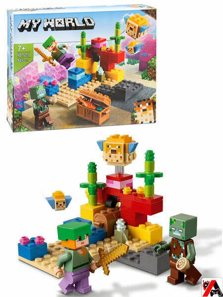 Конструктор Майнкрафт «Коралловый риф» — это увлекательный набор, созданный по мотивам популярной компьютерной игры и позволяющий перенести подводные приключения из виртуального мира в реальность. Сюжет разворачивается в глубинах океана, где среди ярких кораллов и морских обитателей скрыты ценные сокровища. Такой формат игры помогает ребенку не просто собирать модель, а придумывать собственные истории, развивая воображение и фантазию. Главным персонажем набора является Алекс — один из самых узнаваемых героев вселенной Minecraft. Вместе с ней можно исследовать коралловый риф, искать тайники и защищать находки от опасностей. Перевернув крупный желтый камень, открывается сундук с сокровищами, внутри которого спрятаны рыба и жемчужина. Однако рядом может появиться утопленник, превращающий спокойное исследование в динамичное приключение с элементами противостояния. Данный конструктор гармонично сочетает в себе игровой и коллекционный формат. Минифигурки выполнены в узнаваемом стиле, что делает сюжет максимально приближенным к оригинальной игре. Дополнительные аксессуары, такие как меч, водолазный шлем и волшебные штаны, добавляют реалистичности и расширяют возможности для ролевой игры. В свободное от игры время собранная сцена может использоваться как декоративный элемент интерьера детской комнаты. Набор совместим с другими решениями серии лего майнкрафт и lego minecraft, благодаря чему можно объединять разные локации и персонажей в единый мир. Такой подарок подойдет детям от 7 лет, а также всем поклонникам Minecraft, которые хотят разнообразить игровой процесс и воплотить любимую вселенную в реальных конструкциях. Название конструктора далее модель: 1015 (21164) Количество деталей: 92 шт. Количество фигурок: 2 шт.