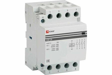 Модульные контакторы представляют из себя контактор в классическом корпусе модульного оборудования. Он состоит из неподвижных контактов, подвижных контактов, которые закреплены в подвижной части магнитной системы. Неподвижная часть магнитной системы закреплена жестко в корпусе КМ. Пружина препятствует смыканию контактов. При подаче напряжения на катушку управления в магнитной системе контактора возникает магнитное поле, которое, преодолевая сопротивление пружины, смыкает магнитную систему и замыкает контакты. При отключении напряжения с катушки управления пружина размыкает контакты. Возможна коммутация алюминиевым и медным проводом. Применение