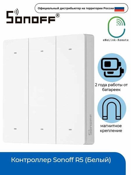 Контроллер Sonoff R5 представлен в форме настенного переключателя. Он предназначен для централизованного управления внутренним освещением с помощью кнопок или пульта дистанционного управления. Контроллер R5 можно добавить к устройствам с функцией «eWeLink-Remote», такими как настенный выключатель M5 или wi-fi реле MINIR3. Он может не только управлять всеми устройствами, когда нет локального сетевого подключения, но также управлять любым другим устройством Sonoff в сценарии, когда есть сетевое подключение. Создав сценарий для освещения в приложении eWeLink, вы можете воспроизвести их с помощью этого контроллера без использования устройства. Это особенно удобно, так как ваш телефон не всегда под рукой, и вы можете управлять всем домашним освещением из одного места. Соединив контроллер сценарием с выключателем серии M5, вы можете управлять одним и тем же источником света с разных позиций, даже когда M5 отключен. Никогда не беспокойтесь и не тратьте время на двустороннюю или многостороннюю проводку управления. R5 работает в 3 различных режимах: поддерживает действие по нажатию, двойному нажатию и длительному нажатию для установки различных типов сценариев по вашему желанию. Вы можете найти правильный метод триггера, например, одну кнопку для одного устройства или даже комнаты (до 18 триггерных действий). Стильный современный дизайн совместим с другими устройствами Sonoff и органично вписывается в интерьер. Со светодиодным индикатором. Вы можете прикрепить R5 к стене как выключатель или использовать его как пульт дистанционного управления. У контроллер R5 в комплектации идут 20 наклеек для кнопок, чтобы обозначить функции кнопок в соответствии с установленными.