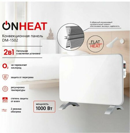 Конвектор ONHEAT FlatHeat используется для обогрева жилых и общественных помещений площадью до 10 м2. Оборудован поворотным термостатом и кнопочным выключателем с выбором мощности работы 500/1000 Вт. Оснащен монолитным алюминиевым Х-образный нагревательным элементом. Имеет низкую тепловую нагруженность, обеспечивая длительный срок службы нагревательного элемента. Прибор не сжигает кислород и не сушит воздух. Исключает продукты сгорания пыли: угарный газ и запах дыма. Устанавливается напольно на ножки с колесами или подвешивается с помощью настенного крепления (в комплекте). Работает от сети 230 В. Способ установки: Настенный/напольный Количество режимов обогрева: 2 Отапливаемая площадь (м2): 10 Мощность (кВт): 1 Нагревательный элемент: Х-образный литой алюминиевый нагревательный элемент Вид управления: Механическое Пульт ДУ: Нет Тип термостата: Механический Отключение при перегреве: Да Комплектация: обогреватель, комплект настенного монтажа, ножки, инструкция Степень защиты от пыли и влаги: IP24 Размер (ШхВхГ) мм: 600х430х240 Вес брутто (кг/шт) : 4.8