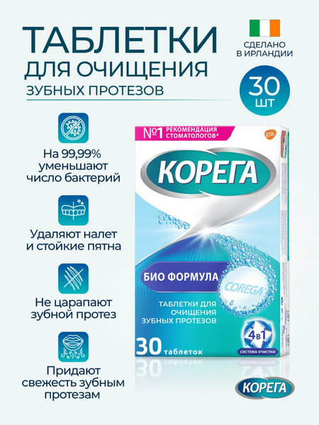 Таблетки Корега "Био формула" обеспечивают эффективную и бережную очистку зубных протезов от налёта, бактерий и неприятного запаха. Формула проникает в труднодоступные участки, не повреждая поверхность протеза и не влияя на его структуру. Рекомендуются для ежедневного ухода. Преимущества: ✅ Эффективное удаление до 99,9% бактерий ✅ Устранение налёта, остатков пищи и запаха ✅ Подходит для частичных и полных зубных протезов ✅ Не повреждает материалы протезов ✅ Удобно использовать – просто растворите таблетку в воде Способ применения: Положите таблетку Корега в стакан тёплой воды. Полностью погрузите зубной протез. Оставьте на 3–5 минут. Очистите щёткой, тщательно промойте под проточной водой. Форма выпуска: Упаковка: 30 шипучих таблеток Корега "Био формула" – свежесть, чистота и уверенность каждый день! Подходит для ежедневного использования.