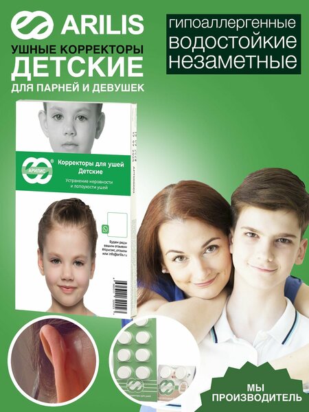 Корректоры для ушей детские Арилис — это идеальная форма ушей вашего ребёнка! Корректоры детские Арилис помогут избавиться от лопоухости. Используя корректоры для ушей, операция больше не нужна! Корректоры для ушей детские — самое удобное и безболезненное решение проблемы лопоухости и асимметрии ушей для детей! Ухо ребёнка формируется вплоть до 9 лет, и в этом возрасте корректор для ушей Арилис может дать вам гарантированное решение проблемы. Вам не придётся мучиться с постоянными снятиями и заменой корректоров, ведь ушные корректоры Арилис, в отличие от большинства аналогов, носятся 3–7 дней. Гипоаллергенны и абсолютно не боятся воды. Корректор для ушей Арилис разработан с учётом особенностей детского уха и полностью исключают возможность залома хрящей, и гарантируют результат после 4–6 месяцев ношения. Эстетический корректор ушей детский полностью незаметен. Арилис — это абсолютный комфорт при ношении. Ушной корректор можно использовать каждый день. Корректоры ушные не боятся воды. Вы сможете принимать душ, спать и жить полной жизнью, не чувствуя абсолютно никакого дискомфорта, используя для ушей корректор. На сегодняшний день корректор для ушей Арилис Детский — это самое качественное решение в отопластики для ушей! Вся продукция Arilis имеет медицинские допуски и необходимые сертификаты. Корректор ушной помогает избавиться от лопоухости. Арилис корректоры для ушей высокого качества. В нашем ассортименте есть и другие товары: Пластырь от пупочной грыжи детский Rupfix Ушные корректоры Арилис Эспандер для челюсти Fint4Face, тренажер для скул Вестибулярная пластина BULA STOPPI Очищающий спрей Арилис для пластырей и корректоров Пластырь силиконовый SILIPLAST