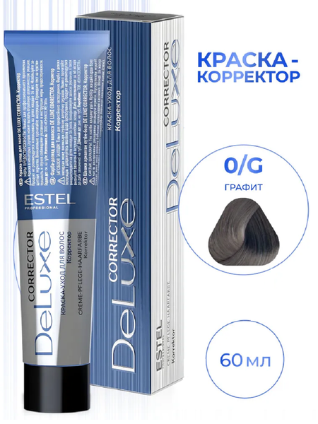 Estel De Luxe Corrector 0/G «Графит» — профессиональная краска-корректор для волос объёмом 60 мл. Описание: добавляется для усиления оттенков пепельного ряда. С помощью корректора можно усилить яркость, интенсивность цвета или нейтрализовать нежелательный цветовой нюанс. Особенности: • подходит для всех типов волос: натуральных, для блонда, мелированных и окрашенных прядей; • самостоятельно работает на заранее обесцвеченных волосах; • за счёт активных ухаживающих компонентов волосы сохраняют мягкость и живой блеск после окрашивания; • в состав входят масла авокадо и макадамии, которые питают структуру волос, делая их более эластичными и визуально плотными.
