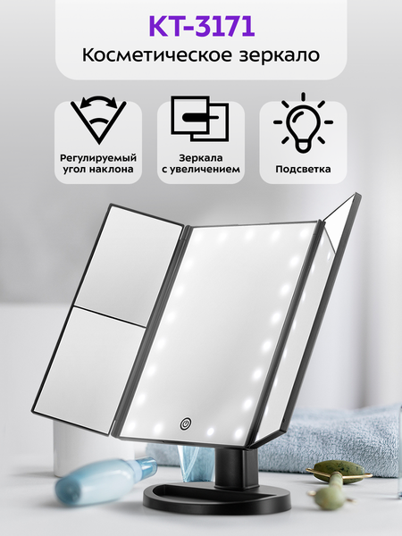 С косметическим зеркалом KT-3171 нанесение макияжа и проведение косметических процедур станет удобнее. Зеркало устанавливается на стол, поэтому ваши руки останутся свободными, и вам будет удобно наносить макияж. Зеркало состоит из центральной части и двух створок. В центральной части располагается большое зеркало без увеличения с подсветкой. В левой створке предусмотрены 2 зеркала: с 2х и 3х кратным увеличением. В правой створке расположено зеркало без увеличения. Благодаря наличию створок можно открыть их так, чтобы видеть себя с трёх сторон. Это может быть удобно, если вы делаете причёску. Также створки можно закрыть при хранении зеркала. Отрегулировать наклон зеркала очень просто! Удерживая рукой основание зеркала, другой рукой наклоняйте зеркало за верхнюю часть. Устанавливайте наклон для удобного и комфортного использования. Контурная подсветка центрального зеркала поможет лучше разглядеть все мелкие детали даже в условиях недостаточного освещения в помещении. Подсветку можно отключить или настроить яркость с помощью кнопки «Вкл/Выкл». У подставки зеркала есть бортики, поэтому вы можете хранить на ней небольшие аксессуары или косметологические инструменты. Подсветка зеркала работает при подключении к источнику питания или от 4 батареек типа ААА. Это позволяет пользоваться зеркалом и включать подсветку в любом удобном месте.