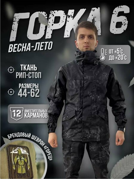 Данная горка выполнена из ткани рип-стоп, плотность 220-240 гр. Это усиленная ткань, полностью пролитая армированной нитью, что обеспечивает полную защиту костюма от порезов и порывов. Она чаще всего используется для изделий, подвергающихся экстремальным воздействиям. Костюм обработан влагостойкой пропиткой, что обеспечивает защиту изделия от любой непогоды. Костюм не продувается, не выгорает, не шуршит и не садится. Куртка на молнии, с ветро-влагозащитным клапаном, с пуговицами на канадской ленте. На ней 6 карманов: 2 нагрудных на молнии,2 боковых на пуговицах,2 на плечах на молнии. Капюшон регулируется утяжкой. Брюки так же оснащены 6-ю карманами: 2 боковых, 2 набедренных на пуговицах и 2 сзади на замках. Внизу у брюк имеются пыльники, которые предназначены для защиты ваших ног от насекомых, пыли и грязи. В комплект входит: Куртка; фирменный шеврон "Горец"; нейтральный шеврон в цвет костюма; брюки, подтяжки. Оттенок ткани может отличаться от фото