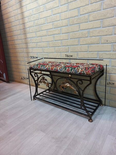 Кованая банкетка, Студия кованой мебели Нива, цвет золотисто-коричневый Кованая банкетка 37 от Студий кованой мебель НиВа Размер: высота до сидения 48 см длина 75 см глубина 33 см. Описания: Кованые банкетки от производителя! Отличное качество, ручная работа! Санкт-Петербург. Гарантия 3 года! Ручная работа. Горячая ковка. В банкетке используются материалы: Квадрат 10х10мм . Сварка используется по периметру сварных соединений, что значительно повышает прочность. Покраску используем порошковую, и итальянскую патину что значительно повышает износостойкость.