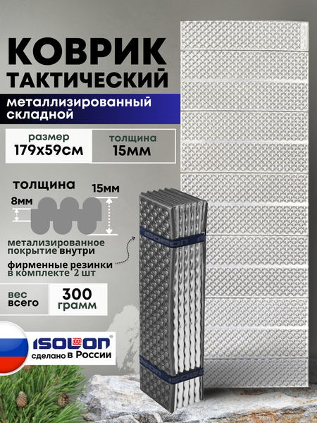 Туристический коврик Металлик Flex компактный складной коврик с хорошими показателями теплоизоляции разработан для активного отдыха — это универсальный аксессуар, который станет незаменимым помощником во время туристических походов и пикников, отдыха на пляже или рыбалки. Он обеспечит комфортное место для сидения или сна, защитит от влаги и холода, а также сохранит тепло в холодное время года. Этот складной коврик имеет толщину по верхним граням ячеистой поверхности 15 мм, что обеспечивает максимальный комфорт и эффективную термоизоляцию. Он выполнен из физически сшитого пенополиэтилена Isolon, экологичного материала, безопасного для контактов с кожей человека. Изолон обеспечивает мягкость и упругость. Пенка водонепроницаема, не впитывает влагу и грязь. Легко моется водой без использования чистящих средств. Уникальная конструкция позволяет легко и быстро его разложить и сложить обратно, что делает его компактным и удобным для переноски. Он занимает минимум места багажнике автомобиля, что особенно актуально во время поездок на природу или кемпинга. Размер в сложенном виде: 60 х 15 х 11 см. Он идеально подойдет для горных походов, охоты и рыбалки или путешествий на велосипеде. Не утяжеляет рюкзак туриста: вес всего 300 грамм. Более компактный, чем рулонные пенки. Легко складывается в 12 сложений и может быть использован как сидушка на привале или в лодке. Размер коврика в развернутом виде 179 х 59 см. Защищает от холода и сырости. Подходит для использования в помещении и на улице. Изготовлен на АО «Ижевский завод пластмасс», Россия.