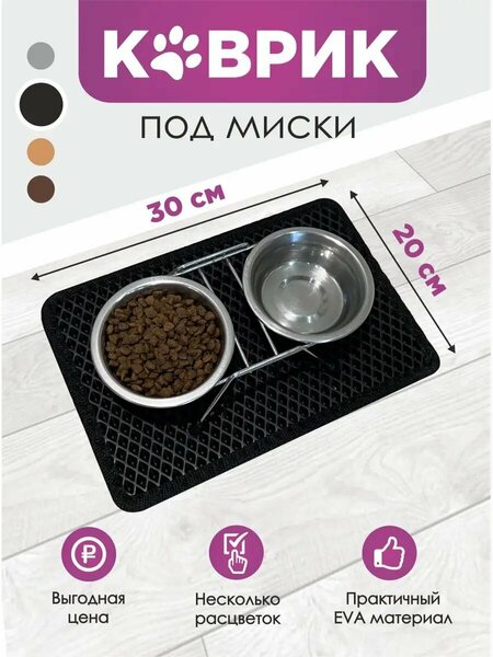 Достоинства:Отличный коврик. Согласна с отзывами. И вода на нем разлитая и корм.Хорошо моется.Пол чистый.Кот ест аккуратно, но пес все разбрасывает и разливает.Тырит корм у кота. Нужно быстро сесть и убежать.
