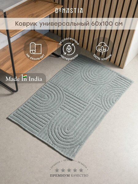 Коврик универсальный DeNASTIA 60x100 см. Коврик для ванной комнаты и туалета изготовлен из 100% Индийского хлопка. Хлопок обладает отличными впитывающими свойствами, быстро сохнет, гигиеничен, гипоаллергенный. Хлопковая нить, оборотной стороны коврика пропитана резиновым противоскользящим составом, который позволяет ему быть устойчивым на любой поверхности. Коврик универсального назначения, способен украсить любую комнату. Подойдёт для ванной, гостиной, спальни и детской комнаты. Не прихотлив в уходе, возможна стирка изделия с применением нейтрального моющего средства.